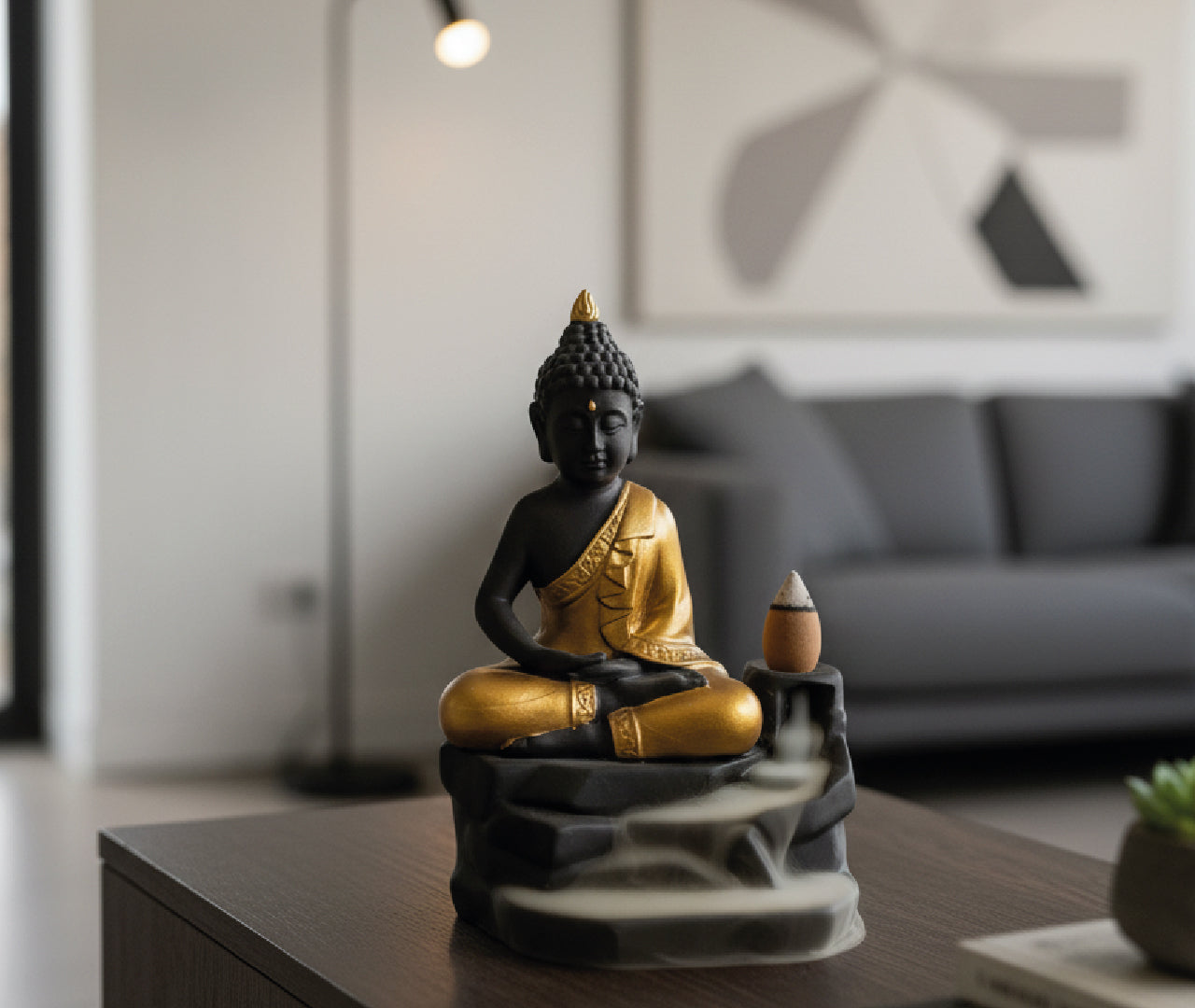 ✨Convierte cualquier rincón en tu santuario personal con este elegante quemador de incienso en forma de Buda. Su figura en meditación (mudra dhyana) y su túnica dorada reflejan la armonía y el equilibrio, mientras el humo desciende en forma de cascada hipnótica que invita a la calma y la introspección.